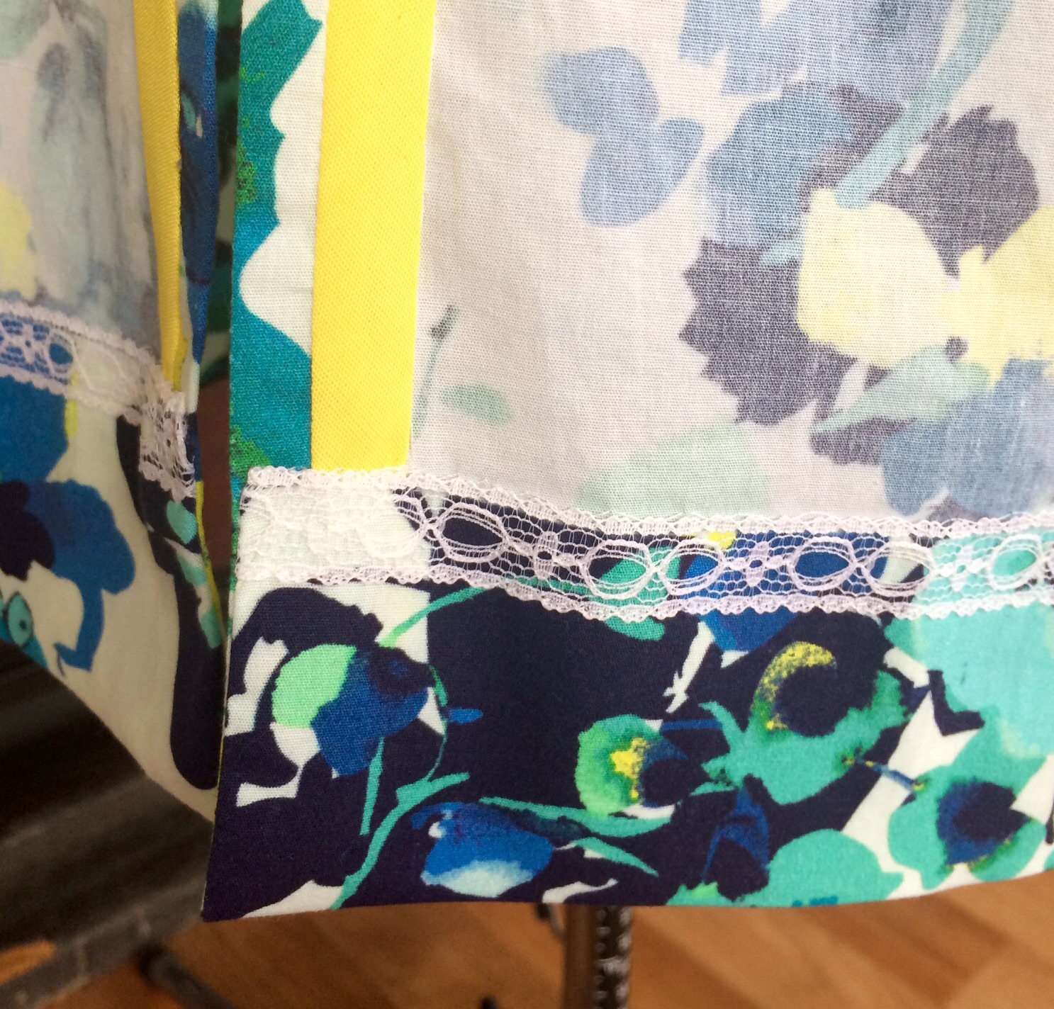 I had to improvise a bit on the inside along the slits since I was unhappy with the pattern design. I chose to use bright yellow bias tape to conceal the overlooked (aka: ugly) fabric edge.