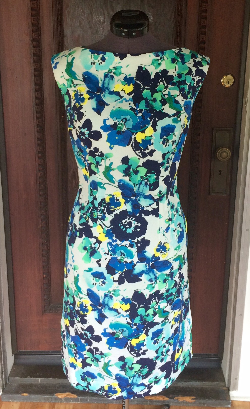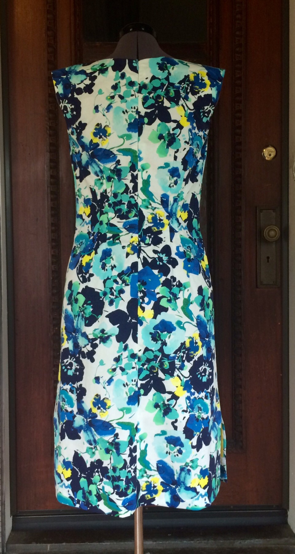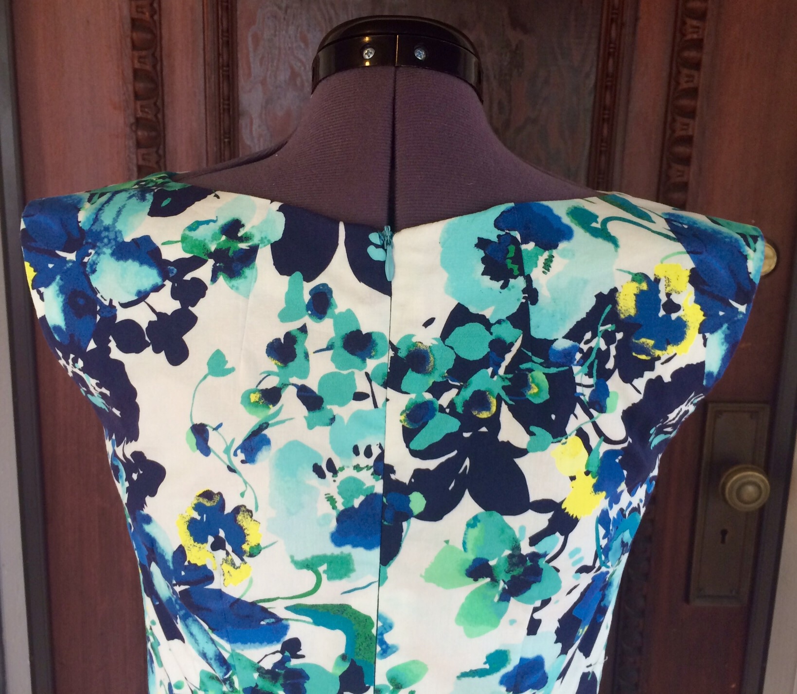 This is Simplicity 1301 in a floral Cotton/Lycra blend with short Ambiance rayon lining. I will definitely make this pattern again. I love the bateau neckline, slim fitting bodice, lack of a waist seam, and the slits on each side at the hem.